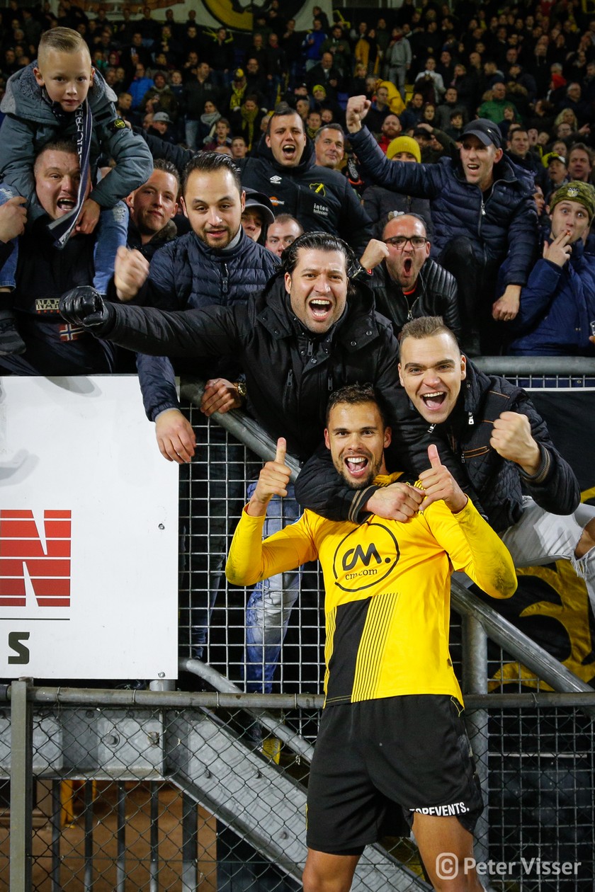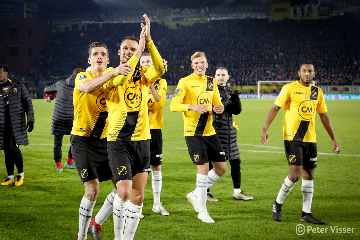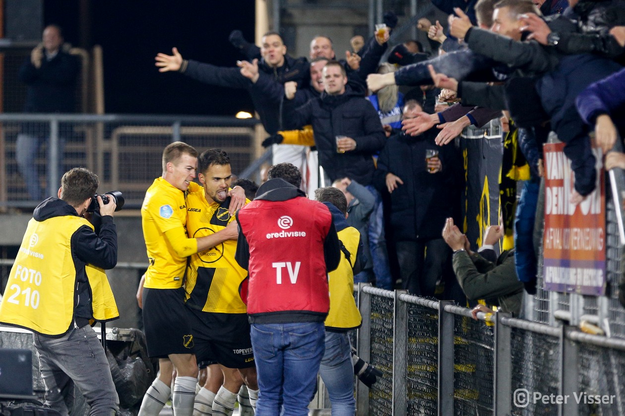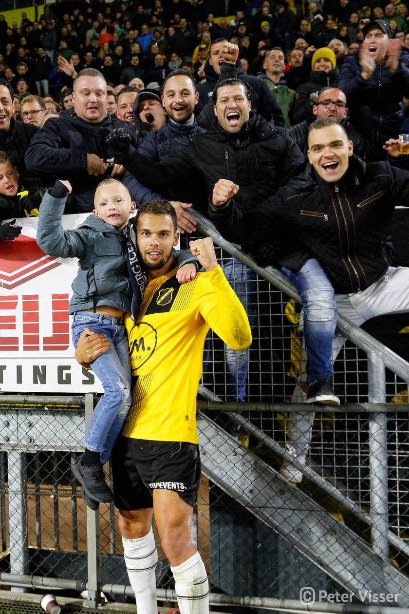 Helaas verdween aan het begin van 2e helft de goed spelende Ilic van het veld. Bij een actie in de 1e helft werd hij aangetikt en ging zo door zijn enkel. Een enorme domper voor hem en zeker ook voor het elftal. Maar…. zijn vervanger de Korte is een bijtertje en niet minder belangrijk een publiekslieveling. Vol gas dus maar weer. Hoewel Heracles niet of nauwelijks bij machte was het NAC goal te bereiken, vloog de bal er toch weer in. Een snoeihard afstandsschot in de 60e minuut van Kuwas vloog langs alles en iedereen inclusief keeper van Leer. Vanaf dat moment was NAC even het spoor bijster. Heracles ging op zoek naar de 3 punten en kreeg daartoe een aantal mogelijkheden. Goed werk van van Leer en Koch deden erger voorkomen. Werd het billenknijpen tot het einde of durfde de thuisploeg nog wat te forceren in de slotfase? Eindelijk werd het heilige woord NOAD bewaarheid. Een voorzet van Rosheuvel over links werd door te Vrede, met een man in zijn rug, perfect aangenomen. Wegdraaiend van zijn tegenstander joeg hij de bal hoog in de touwen. Het stadion ontplofte!! Met nog 2 minuten op de klok was de buit binnen. Eindelijk, eindelijk, eindelijk een zoete overwinning.