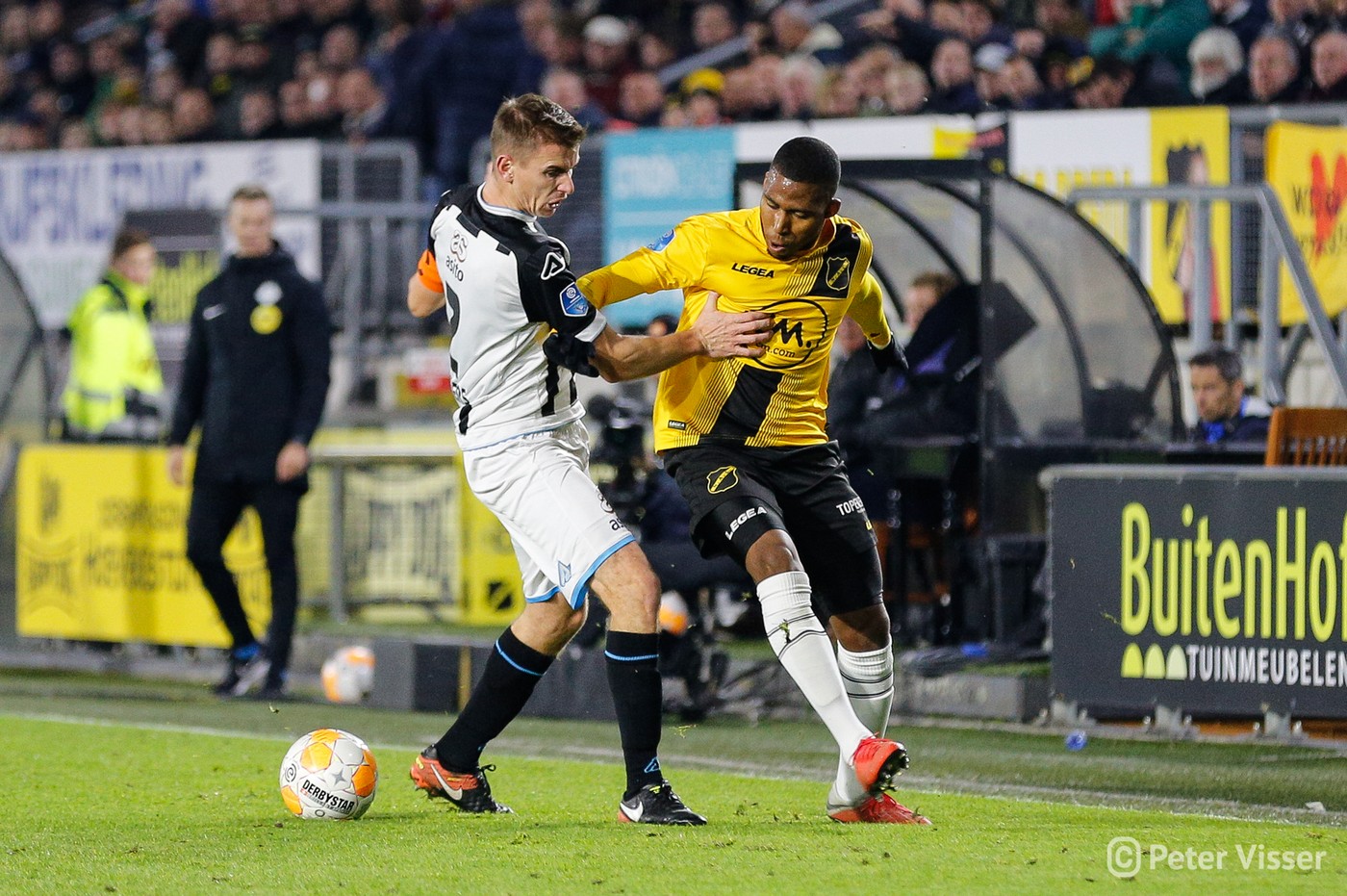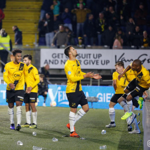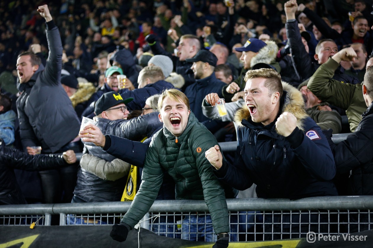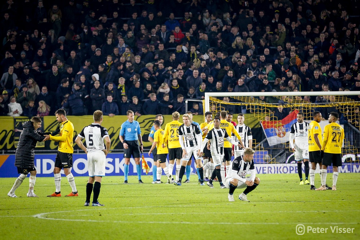 Helaas verdween aan het begin van 2e helft de goed spelende Ilic van het veld. Bij een actie in de 1e helft werd hij aangetikt en ging zo door zijn enkel. Een enorme domper voor hem en zeker ook voor het elftal. Maar…. zijn vervanger de Korte is een bijtertje en niet minder belangrijk een publiekslieveling. Vol gas dus maar weer. Hoewel Heracles niet of nauwelijks bij machte was het NAC goal te bereiken, vloog de bal er toch weer in. Een snoeihard afstandsschot in de 60e minuut van Kuwas vloog langs alles en iedereen inclusief keeper van Leer. Vanaf dat moment was NAC even het spoor bijster. Heracles ging op zoek naar de 3 punten en kreeg daartoe een aantal mogelijkheden. Goed werk van van Leer en Koch deden erger voorkomen. Werd het billenknijpen tot het einde of durfde de thuisploeg nog wat te forceren in de slotfase? Eindelijk werd het heilige woord NOAD bewaarheid. Een voorzet van Rosheuvel over links werd door te Vrede, met een man in zijn rug, perfect aangenomen. Wegdraaiend van zijn tegenstander joeg hij de bal hoog in de touwen. Het stadion ontplofte!! Met nog 2 minuten op de klok was de buit binnen. Eindelijk, eindelijk, eindelijk een zoete overwinning.